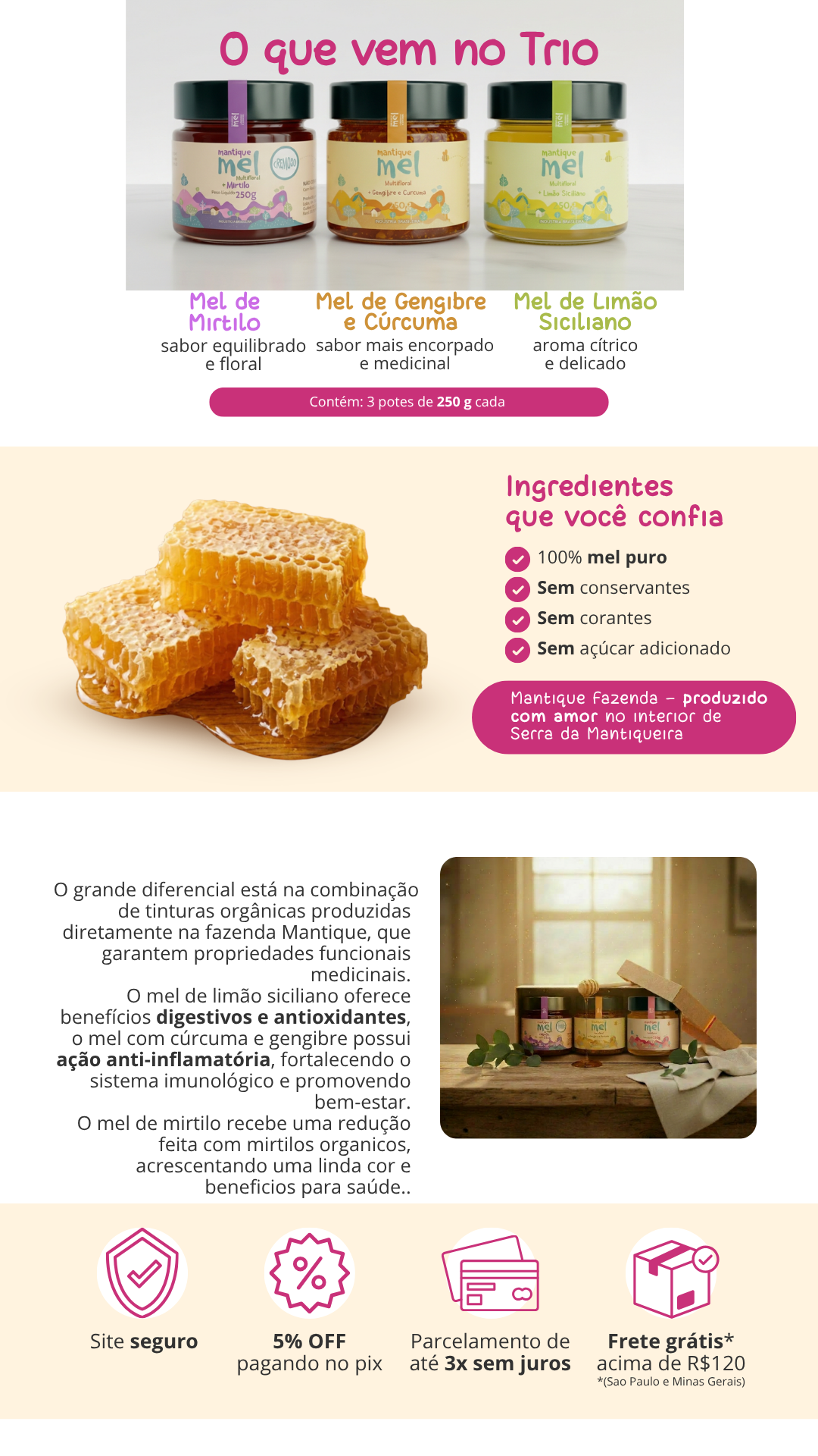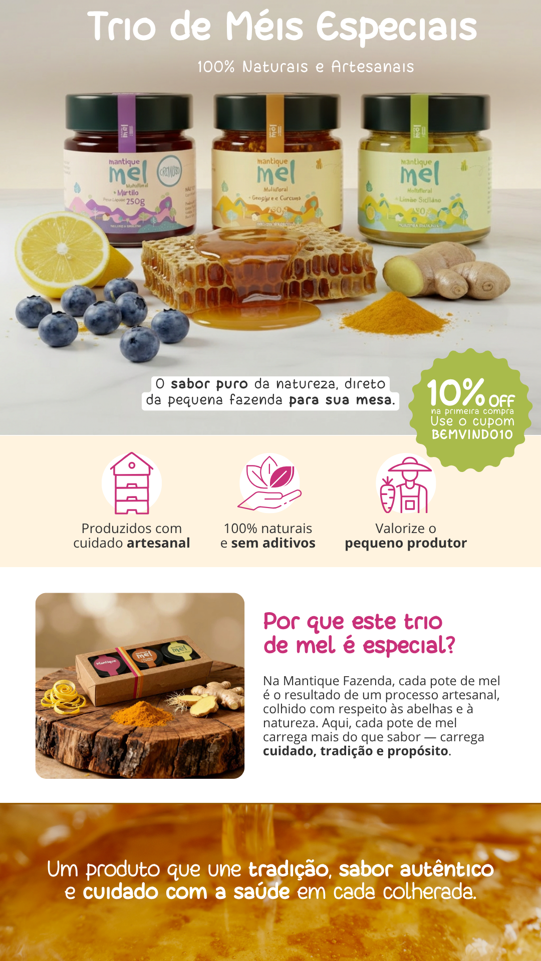 Eleve sua experiência gastronômica e sua rotina de saúde com uma seleção exclusiva da Mantique Fazenda. Este trio não é apenas mel; é o resultado de processos artesanais que concentram o melhor da natureza em cada pote de 250g.